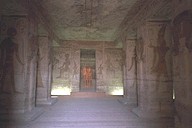 Durch das Portal betritt man die annähernd quadratische Pfeilerhalle, die von sechs Pfeilern in drei Schiffe gegliedert wird.Die Wandreliefs sind schlichter und weniger farbig angelegt als die des großen Tempels, doch sind auch sie von hohem künstlerischen Wert. |